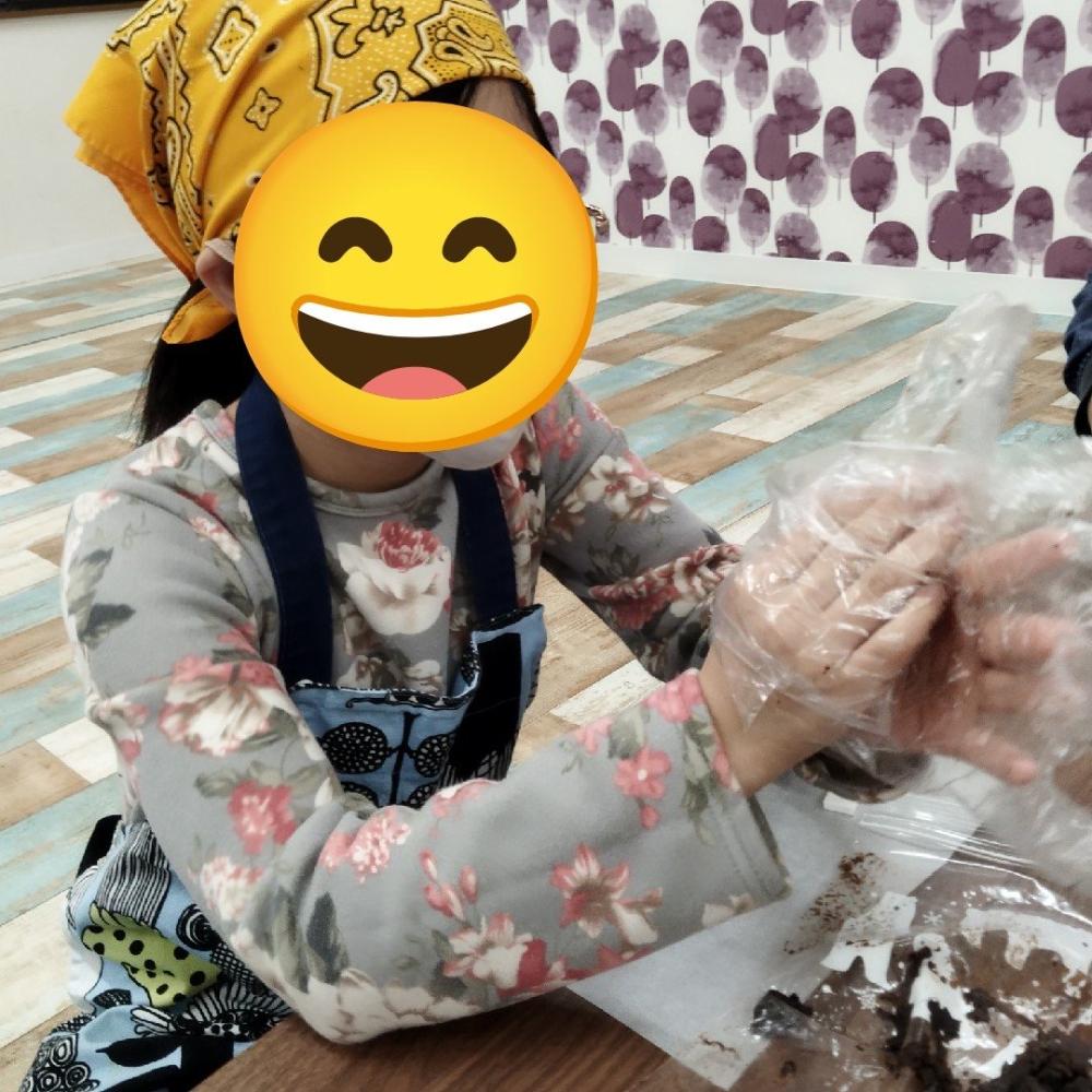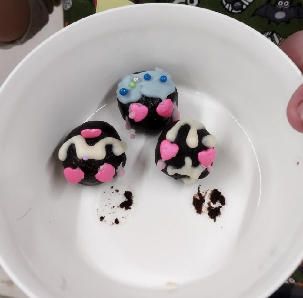 チョコパイを潰して牛乳を加え、自分の食べたい大きさに丸めてトリュフを作りました。お好みでキラキラにしたり、好きなキャラクターをイメージしてチョコペンでお絵かきをしたりしました✨